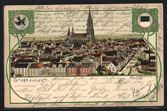 Lithographie Ulm / Donau, Teilansicht mit Münster, Stadtwappen