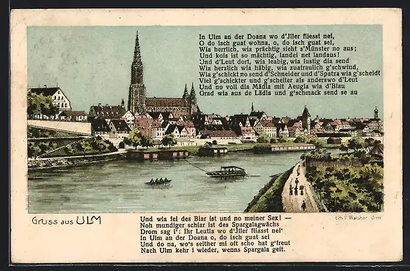Lithographie Ulm / Donau, Uferpartie mit Münster