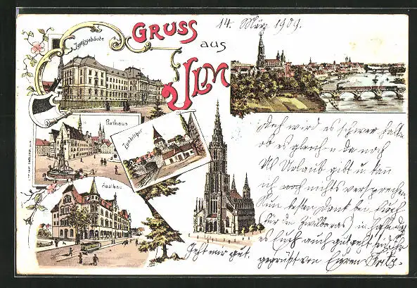Lithographie Ulm, Justizgebäude, Saalbau, Zundelthor