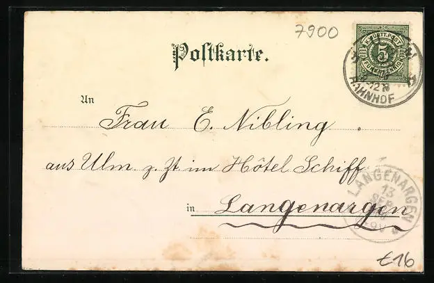 Personenbezogene Daten auf der Rückseite der Karte wurden durch blauen Textmarker unkenntlich gemacht. Die blauen Stellen sind auf die Vorderseite durchgeweicht und wirken sich negativ auf das Postkartenfoto aus