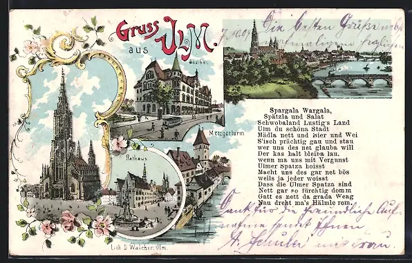 Lithographie Ulm, Metzgerturm, Rathaus, Saalbau