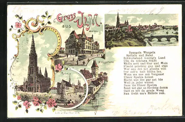 Lithographie Ulm, Metzgerturm, Saalbau, Münster