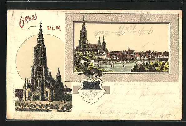 Lithographie Ulm, Münster, Panorama mit Brücke