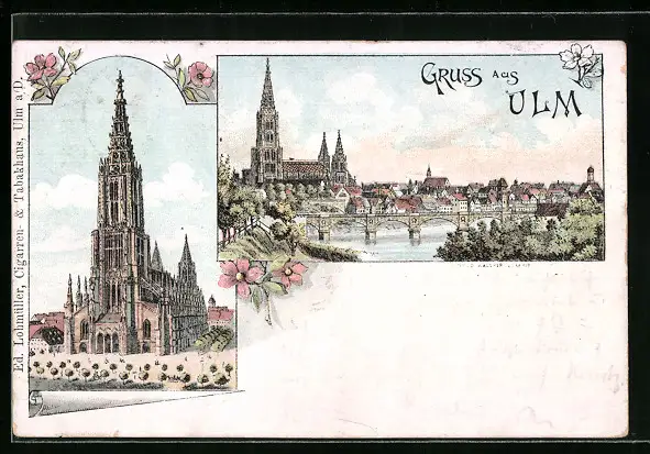 Lithographie Ulm, Ortsansicht mit Dom, Nahaufnahme des Doms
