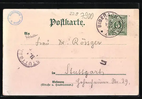 Personenbezogene Daten auf der Rückseite der Karte wurden durch blauen Textmarker unkenntlich gemacht. Die blauen Stellen sind auf die Vorderseite durchgeweicht und wirken sich negativ auf das Postkartenfoto aus