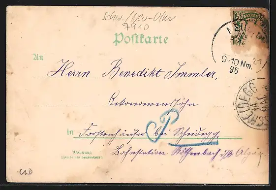 Personenbezogene Daten auf der Rückseite der Karte wurden durch blauen Textmarker unkenntlich gemacht. Die blauen Stellen sind auf die Vorderseite durchgeweicht und wirken sich negativ auf das Postkartenfoto aus