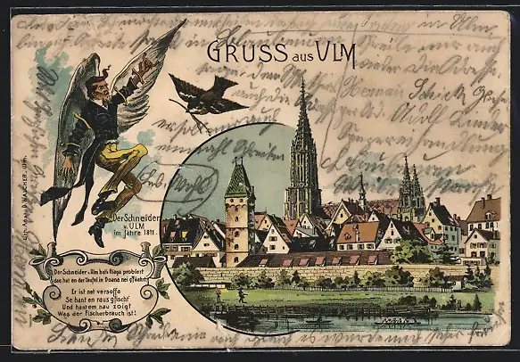 Lithographie Ulm, Schneider von Ulm und Ortsansicht vom Wasser aus
