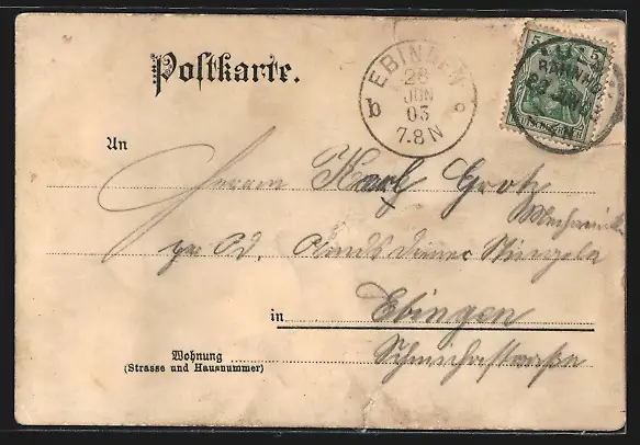 Personenbezogene Daten auf der Rückseite der Karte wurden durch blauen Textmarker unkenntlich gemacht. Die blauen Stellen sind auf die Vorderseite durchgeweicht und wirken sich negativ auf das Postkartenfoto aus