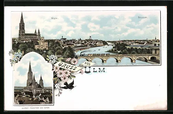 Lithographie Ulm, Totalansicht mit Neuulm und Münster