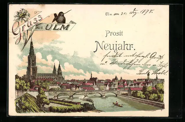 Lithographie Ulm, Uferpartie mit Münster, Neujahrsgruss