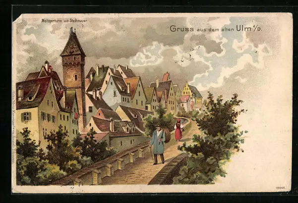Lithographie Ulm a. D., Metzgerturm mit Stadtmauer