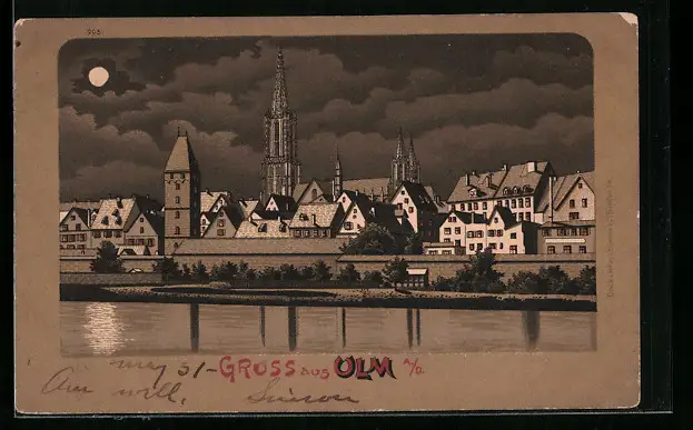 Lithographie Ulm a. D., Teilansicht im Mondlicht, Münster