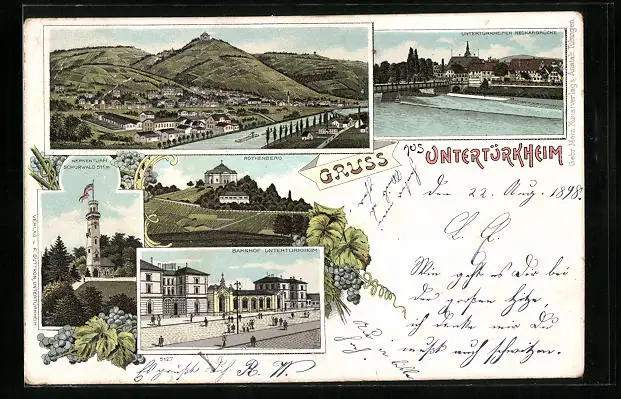 Lithographie Untertürkheim, Bahnhof, Kernenturm Schurwald, Neckarbrücke