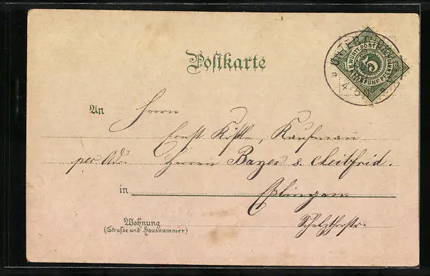 Personenbezogene Daten auf der Rückseite der Karte wurden durch blauen Textmarker unkenntlich gemacht. Die blauen Stellen sind auf die Vorderseite durchgeweicht und wirken sich negativ auf das Postkartenfoto aus