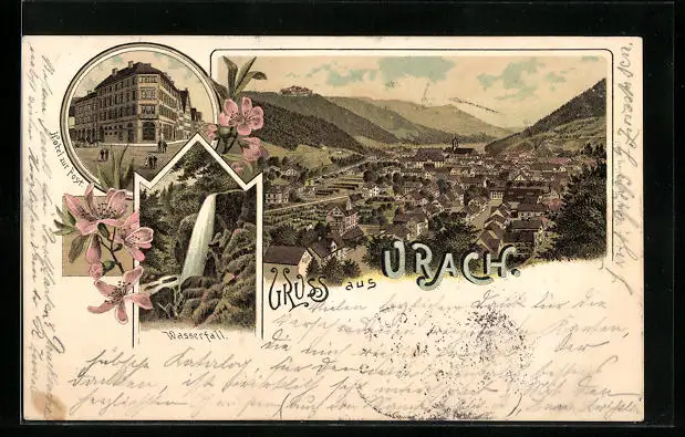 Lithographie Urach, Hotel zur Post, Wasserfall, Gesamtansicht
