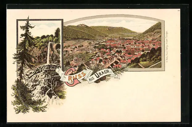 Lithographie Urach, Ortsansicht mit Wasserfall