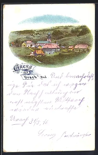 Lithographie Urach i. Bad, Ortsansicht im Tal
