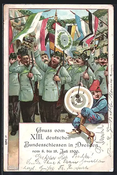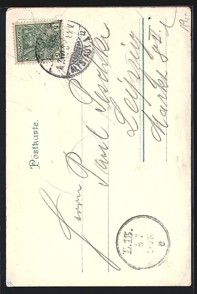 Personenbezogene Daten auf der Rückseite der Karte wurden durch blauen Textmarker unkenntlich gemacht. Die blauen Stellen sind auf die Vorderseite durchgeweicht und wirken sich negativ auf das Postkartenfoto aus