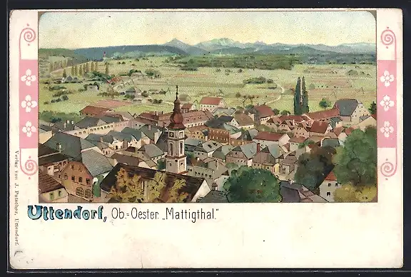 Lithographie Uttendorf /Ob.-Oester., Mattigthal mit Turm