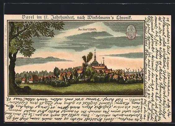 Lithographie Varel /Oldbg., Totalansicht im 17. Jahrhundert