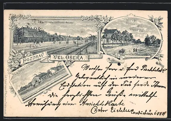 Lithographie Velky Osek, C. k. postovní úrad, Nádrazí severozápadní dráhy, Náves, Bahnhof