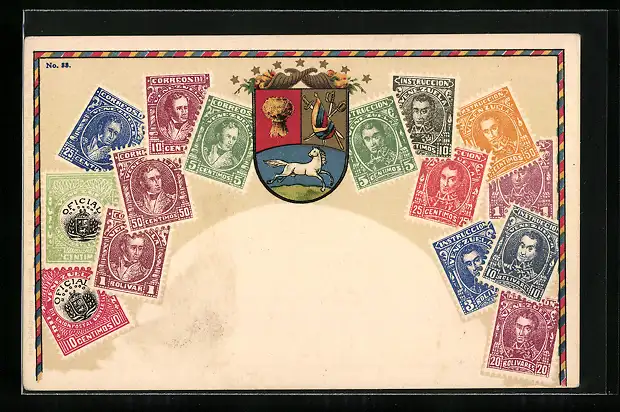 Lithographie Venezuela, Briefmarken und Wappen mit Füllhörnern