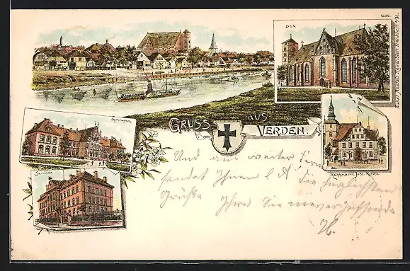 Lithographie Verden, Dom, Rathaus mit Johs.-Kirche, Gymnasium, Seminar