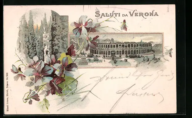 Lithographie Verona, Ortspartie mit Denkmal, Turm