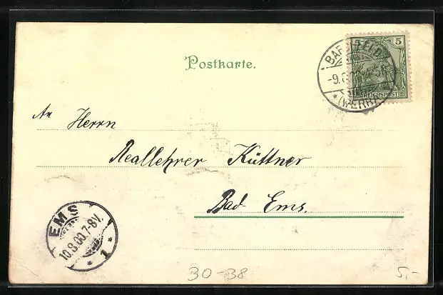 Personenbezogene Daten auf der Rückseite der Karte wurden durch blauen Textmarker unkenntlich gemacht. Die blauen Stellen sind auf die Vorderseite durchgeweicht und wirken sich negativ auf das Postkartenfoto aus