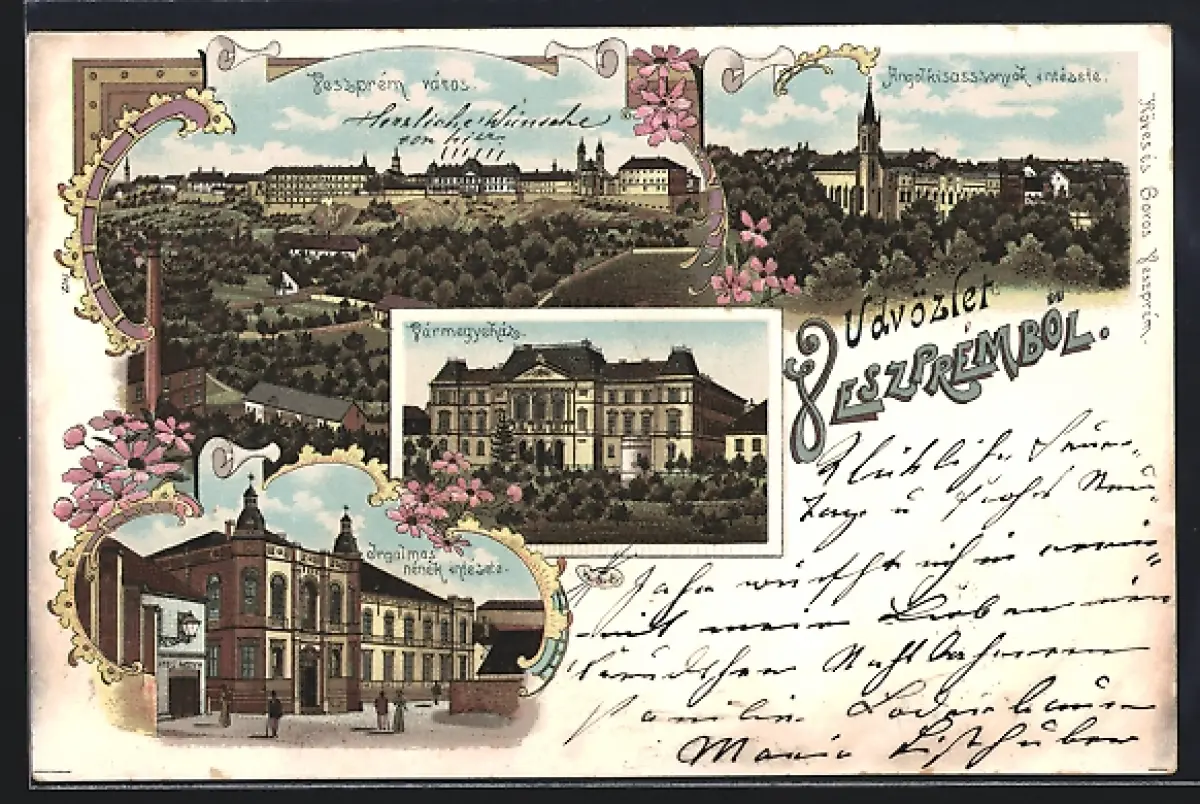 Lithographie Veszprem, Város, Irgalmas nenek intezete, Varmegyehaz
