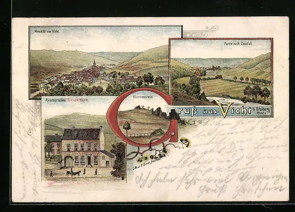 Lithographie Vicht b. Stolberg /Rhld., Restauration Stickeler, Kluckenstein, Partie nach Zweifall