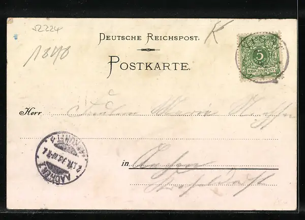Personenbezogene Daten auf der Rückseite der Karte wurden durch blauen Textmarker unkenntlich gemacht. Die blauen Stellen sind auf die Vorderseite durchgeweicht und wirken sich negativ auf das Postkartenfoto aus