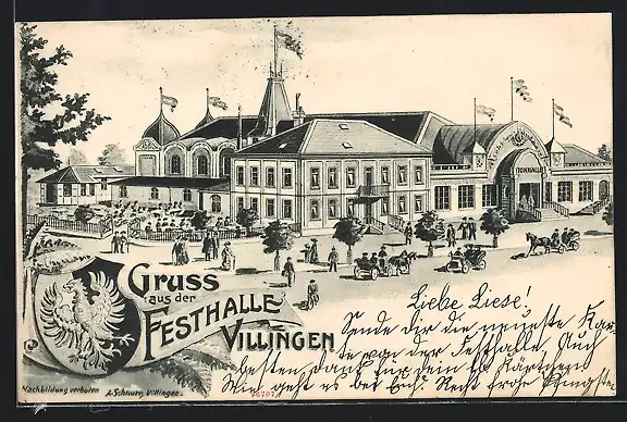 Lithographie Villingen / Baden, Festhalle, Garten, Wappen