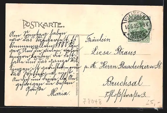 Personenbezogene Daten auf der Rückseite der Karte wurden durch blauen Textmarker unkenntlich gemacht. Die blauen Stellen sind auf die Vorderseite durchgeweicht und wirken sich negativ auf das Postkartenfoto aus