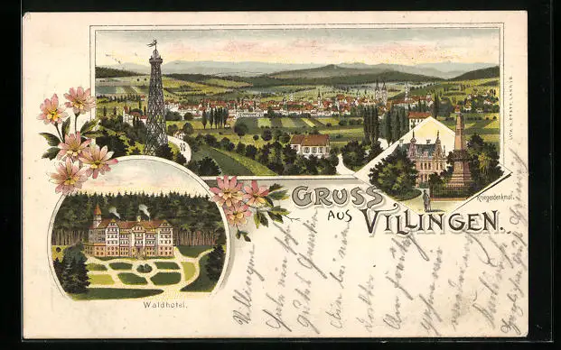 Lithographie Villingen, Kriegerdenkmal, Waldhotel, Totalansicht