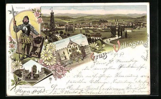 Lithographie Villingen, Ritter Romeius, Rathhaus, Ortsansicht
