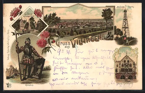 Lithographie Villingen, Totalansicht mit Altem Rathaus
