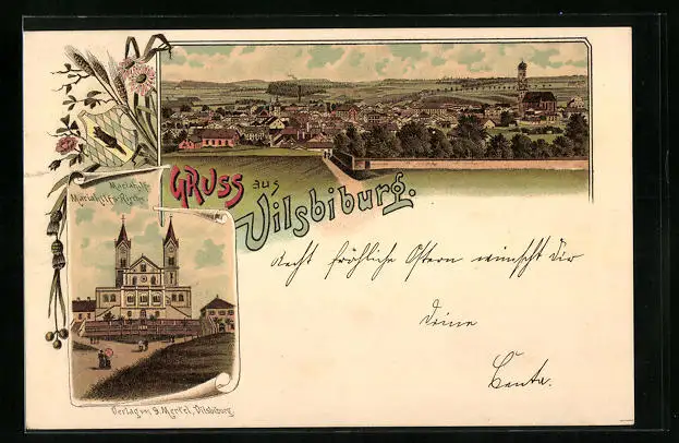 Lithographie Vilsbiburg, Mariahilf-Kirche, Ortsansicht mit Umland