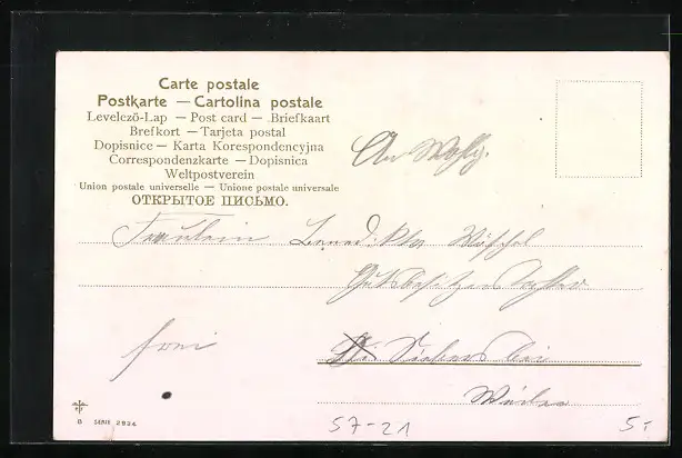 Personenbezogene Daten auf der Rückseite der Karte wurden durch blauen Textmarker unkenntlich gemacht. Die blauen Stellen sind auf die Vorderseite durchgeweicht und wirken sich negativ auf das Postkartenfoto aus
