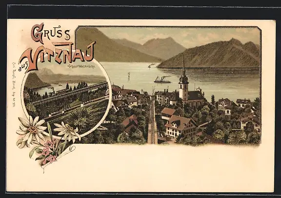 Lithographie Vitznau, Teilansicht mit Kirche, Schnurtobelbrücke