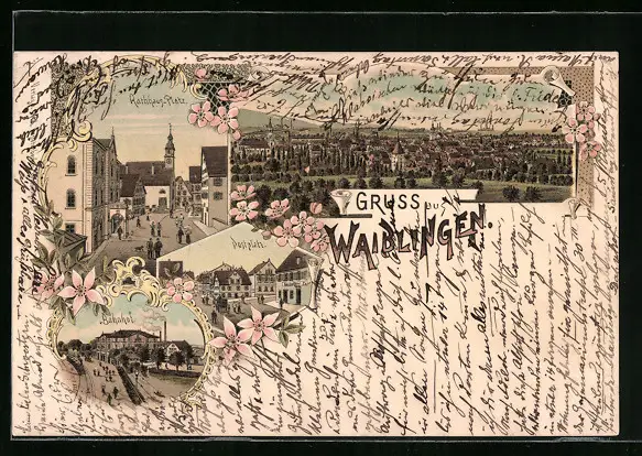 Lithographie Waiblingen, Ortsansicht, Rathhaus-Platz, Bahnhof