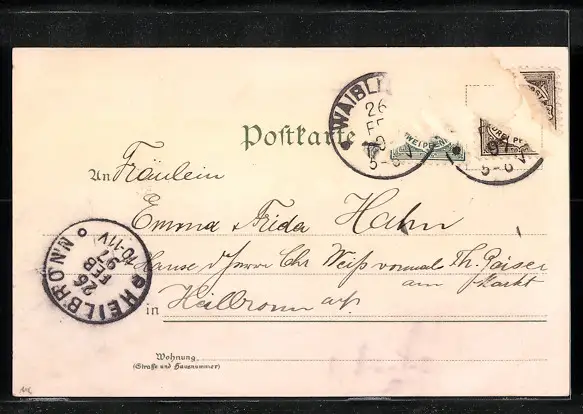 Personenbezogene Daten auf der Rückseite der Karte wurden durch blauen Textmarker unkenntlich gemacht. Die blauen Stellen sind auf die Vorderseite durchgeweicht und wirken sich negativ auf das Postkartenfoto aus