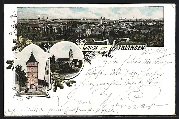 Lithographie Waiblingen, Teilansicht, Kirche, Tor