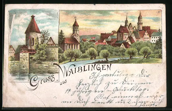 Lithographie Waiblingen, Totalansicht mit Uferpartie