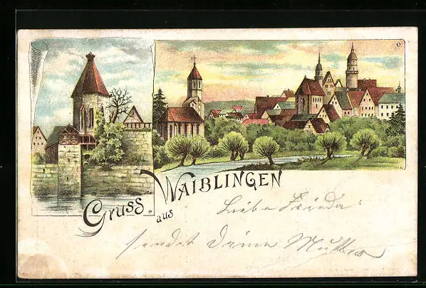 Lithographie Waiblingen, Totalansicht mit Uferpartie