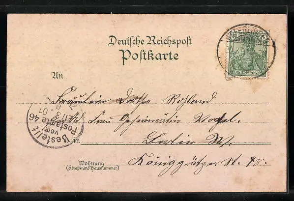 Personenbezogene Daten auf der Rückseite der Karte wurden durch blauen Textmarker unkenntlich gemacht. Die blauen Stellen sind auf die Vorderseite durchgeweicht und wirken sich negativ auf das Postkartenfoto aus