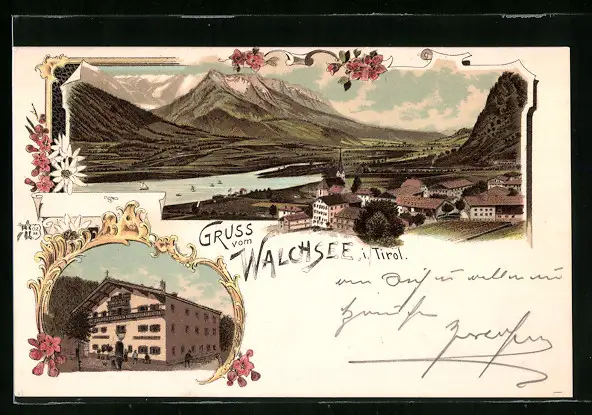 Lithographie Walchsee, Gasthaus und Landschaftspanorama