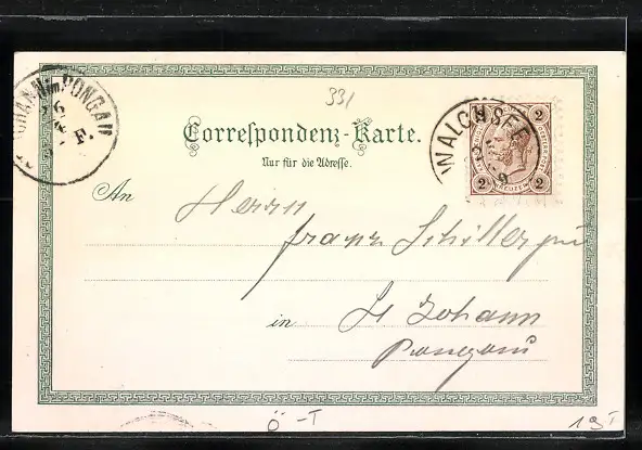 Personenbezogene Daten auf der Rückseite der Karte wurden durch blauen Textmarker unkenntlich gemacht. Die blauen Stellen sind auf die Vorderseite durchgeweicht und wirken sich negativ auf das Postkartenfoto aus