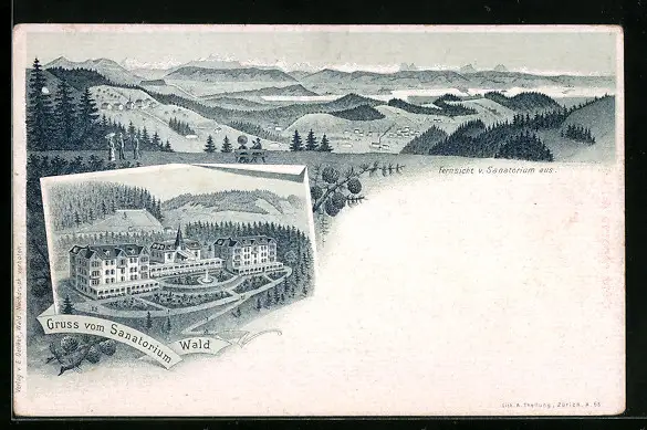 Lithographie Wald, Ansicht vom Sanatorium Wald, Fernsicht auf die Alpen