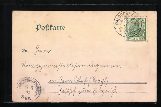 Personenbezogene Daten auf der Rückseite der Karte wurden durch blauen Textmarker unkenntlich gemacht. Die blauen Stellen sind auf die Vorderseite durchgeweicht und wirken sich negativ auf das Postkartenfoto aus
